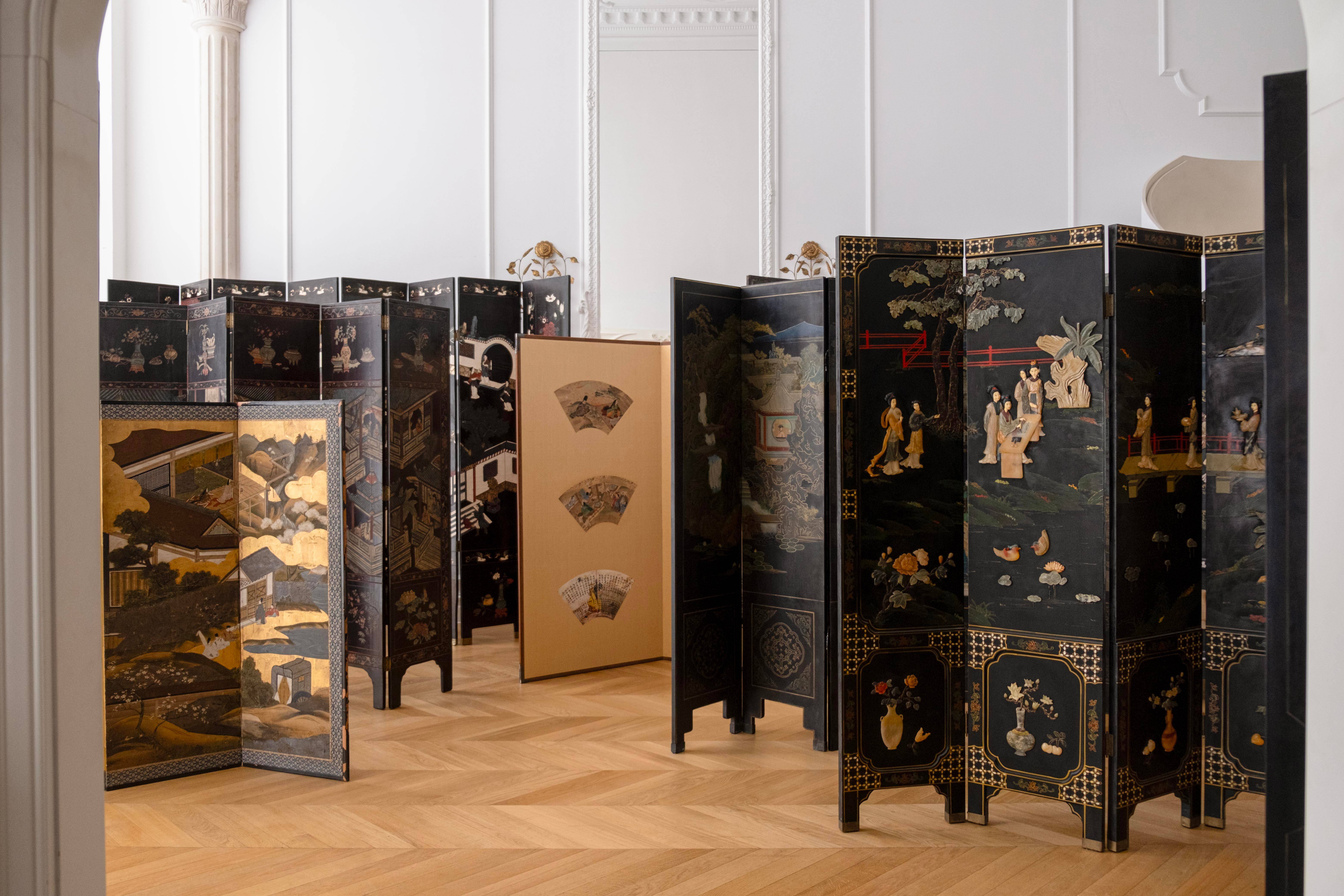 Installed within AMBELIE’s Hangzhou space, the presentation situates these works in dialogue with a Western architectural framework. French-style colonnades and arches provide a measured spatial order against which lacquer, pigment, and narrative unfold. The exhibition reflects AMBELIE’s ongoing approach: to frame Eastern works within a Western spatial language, producing a contemporary interpretation of chinoiserie.